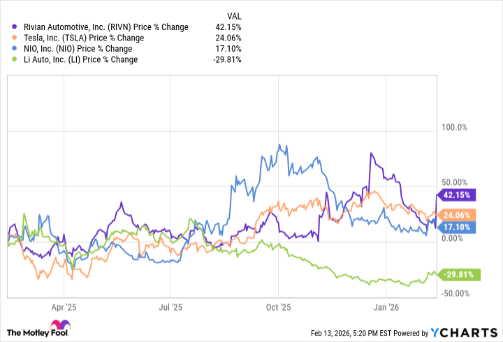 Rivian – игрок не из первых рядов. Капитализация в 21,7 миллиарда долларов, всего 42 247 машин, проданных в 2025 году… Это, знаете, как пытаться затеять вечеринку в пустой квартире. В сравнении с Tesla, у которой капитализация в 1,6 триллиона долларов и 1,6 миллиона машин, это просто смешно. Но вот тут-то и начинается самое интересное: за последний год акции Rivian показали результат лучше, чем Tesla, Li Auto и Nio. Да, вы не ослышались. Небольшой, но приятный сюрприз, согласитесь.